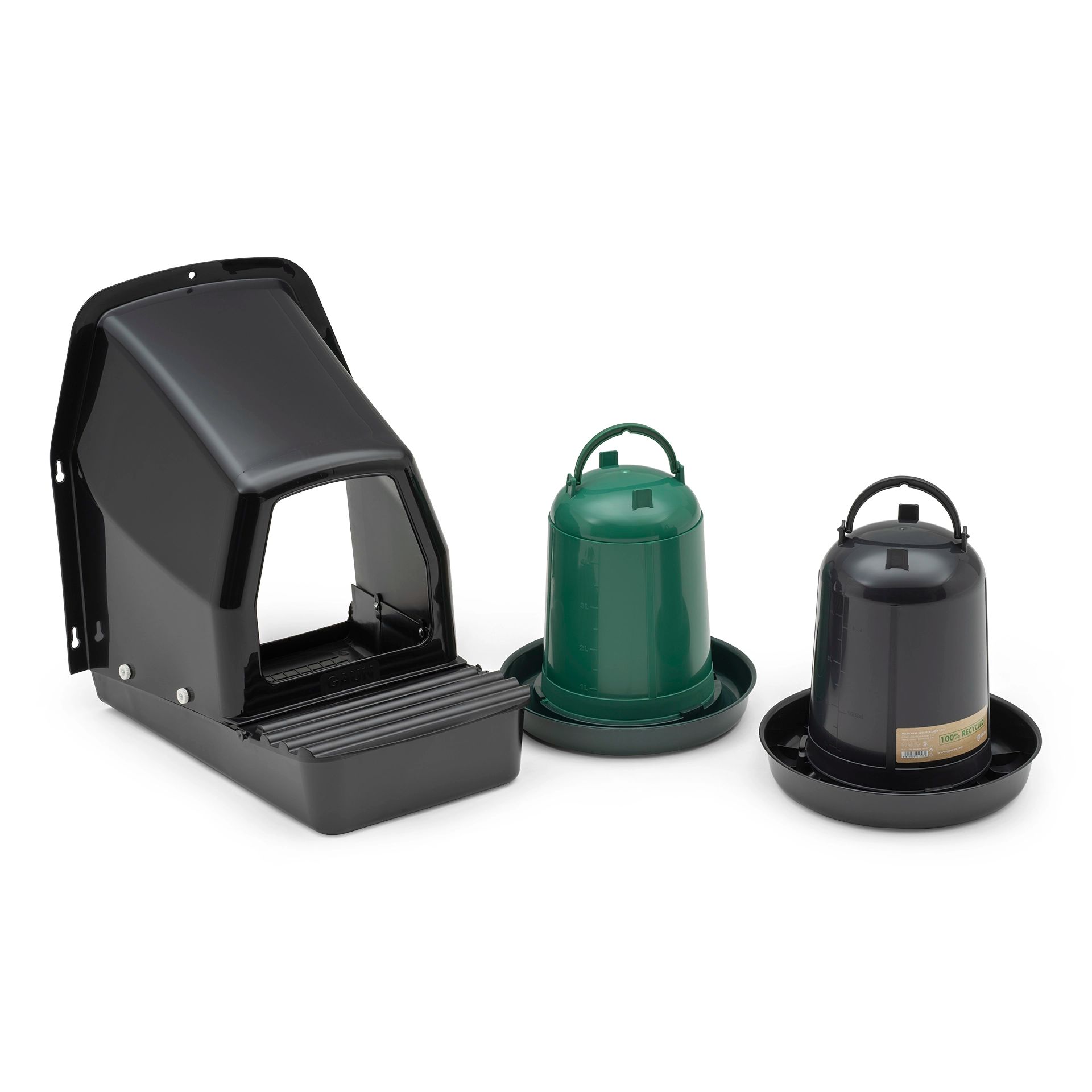 - Include hranitor, adăpător, cuib și cutie pentru ouă