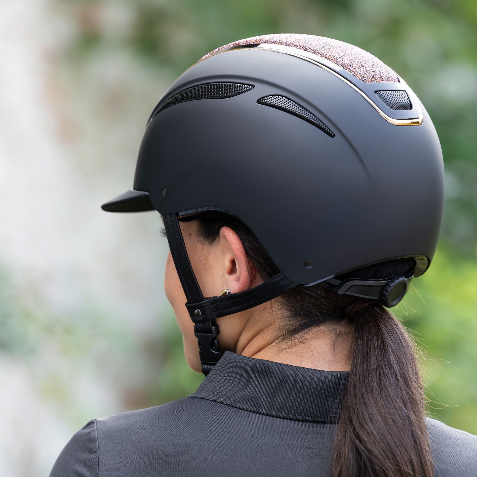 Casca Elite îmbină designul elegant cu funcționalitatea excelentă, astfel încât să fii în siguranță și cu stil în timpul călăriei. Cu ajustarea sa excepțională, asigură o senzație plăcută, chiar și în timpul călăriilor mai lungi. Curelele de prindere din imitație de piele, moi și de înaltă calitate, contribuie la confortul purtării și împiedică alunecarea căștii. În plus, sistemul Disc permite ajustarea continuă, cu o singură mână, a benzii pentru cap la circumferința capului tău - astfel, casca este întotdeauna perfect ajustată. Trebuie menționat în mod special sistemul excelent de ventilație, care asigură un climat optim sub cască.