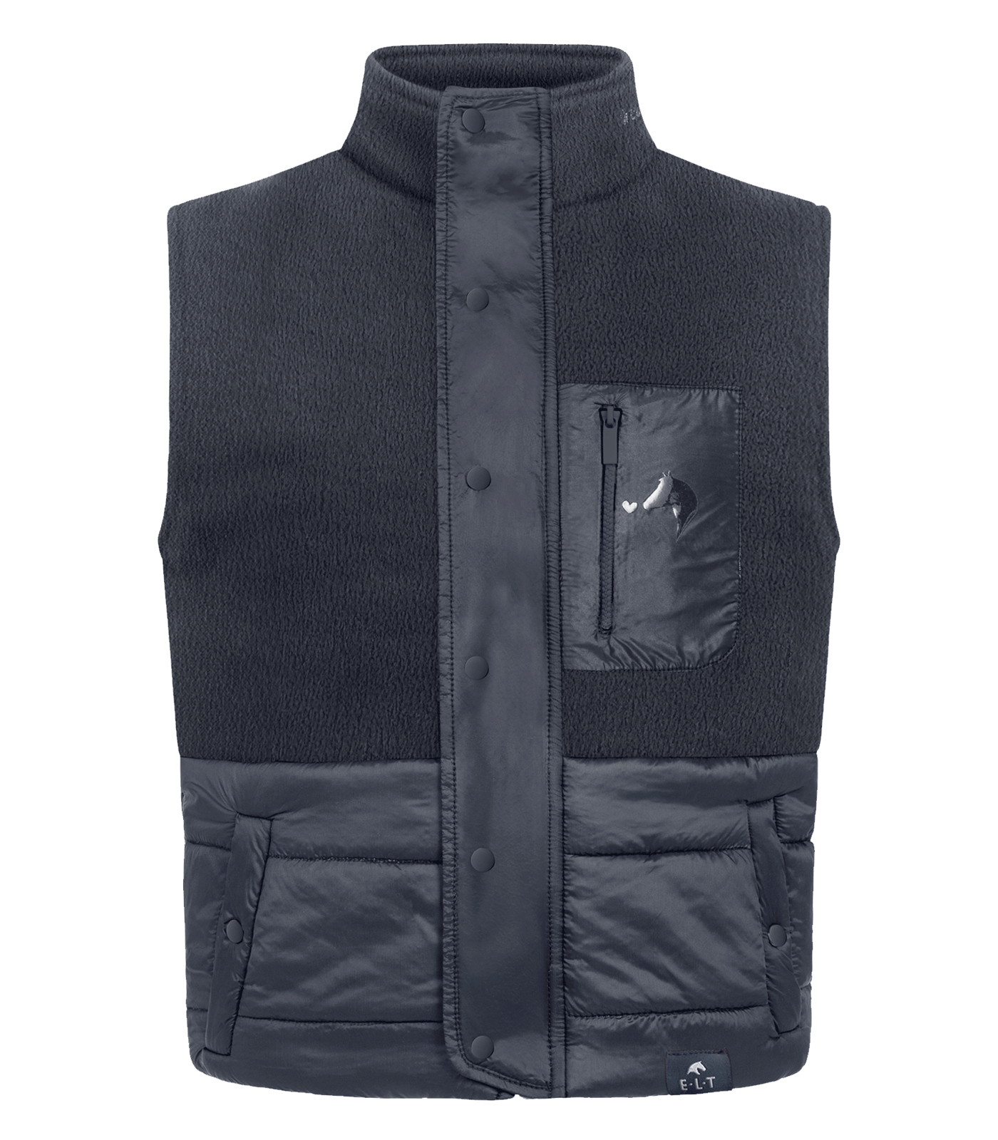 The quilted vest consists of a material mix. The upper section (front and back, collar, and sleeves) is made of cozy fleece. The lower section (front and back, as well as the front placket) is quilted.