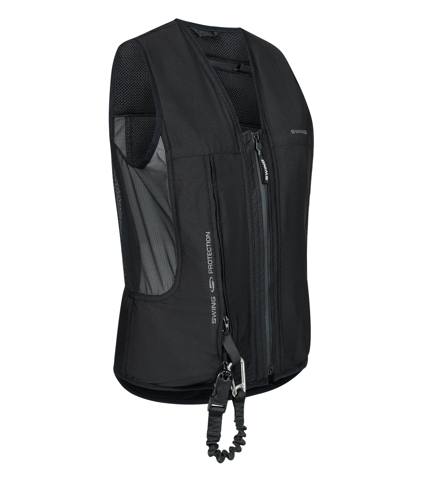 SWING Vesta Airbag P25 AIR este partenerul tău de încredere în sporturile ecvestre, protejându-te pe tine și sănătatea ta. Stabilește noi standarde în ceea ce privește siguranța și combină tehnologia de ultimă generație cu eleganța sportivă. Datorită mecanismului inovator de protecție și a timpului rapid de reacție, vesta îți oferă o protecție eficientă pentru zonele corpului deosebit de vulnerabile. Concepută pentru libertate maximă de mișcare, vesta se adaptează optim corpului tău datorită designului ergonomic și materialului respirabil.