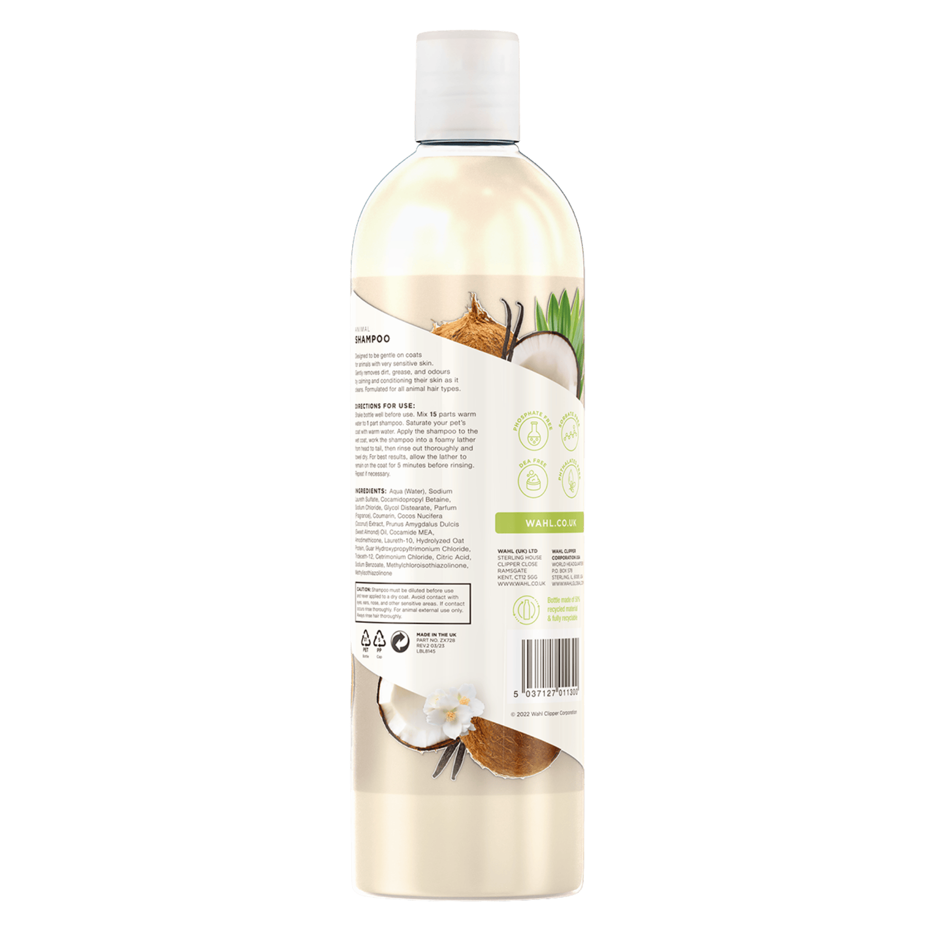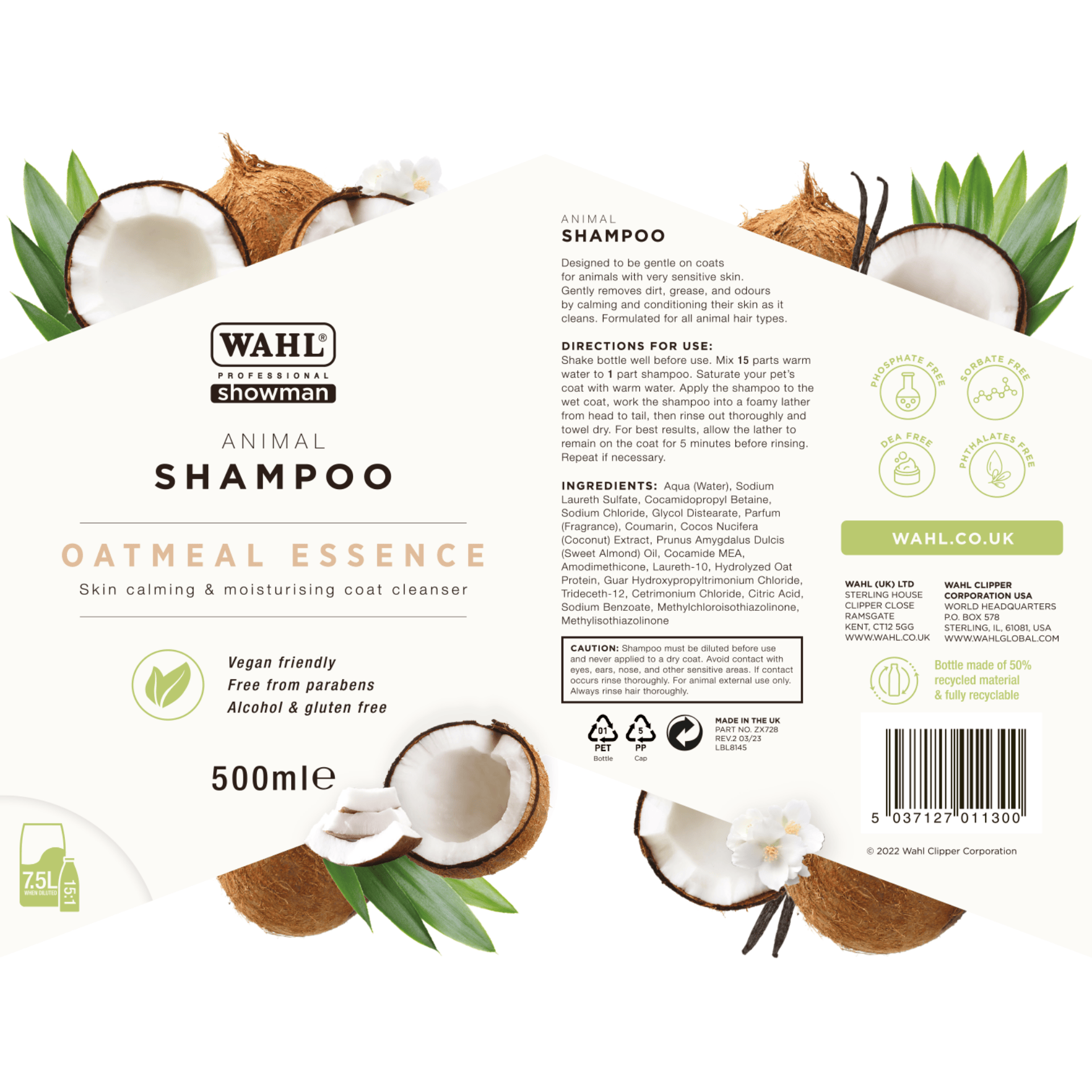 Șamponul concentrat pentru câini Wahl Oatmeal Essence oferă o curățare calmantă pentru câinii cu piele uscată, descuamată sau predispusă la mâncărimi. Un avantaj cheie este proporția de amestec foarte economică de 1:15: dintr-o sticlă de 500 ml de concentrat se pot amesteca 7,5 litri de șampon gata de utilizare. Acest lucru face ca produsul să fie o soluție foarte rentabilă pentru îngrijirea regulată a blănii.