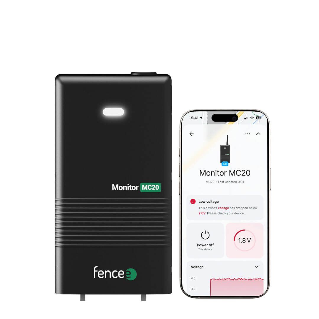 Supraveghere fără limite: fencee Monitor MC20 este soluția pentru pășuni îndepărtate, unde nu există WLAN și niciun Gateway în apropiere. Datorită tehnologiei integrate eSIM și LTE/4G, acest monitor se conectează direct la rețeaua de telefonie mobilă. Monitorizează tensiunea gardului tău și trimite datele în timp real către aplicația fencee Cloud App.