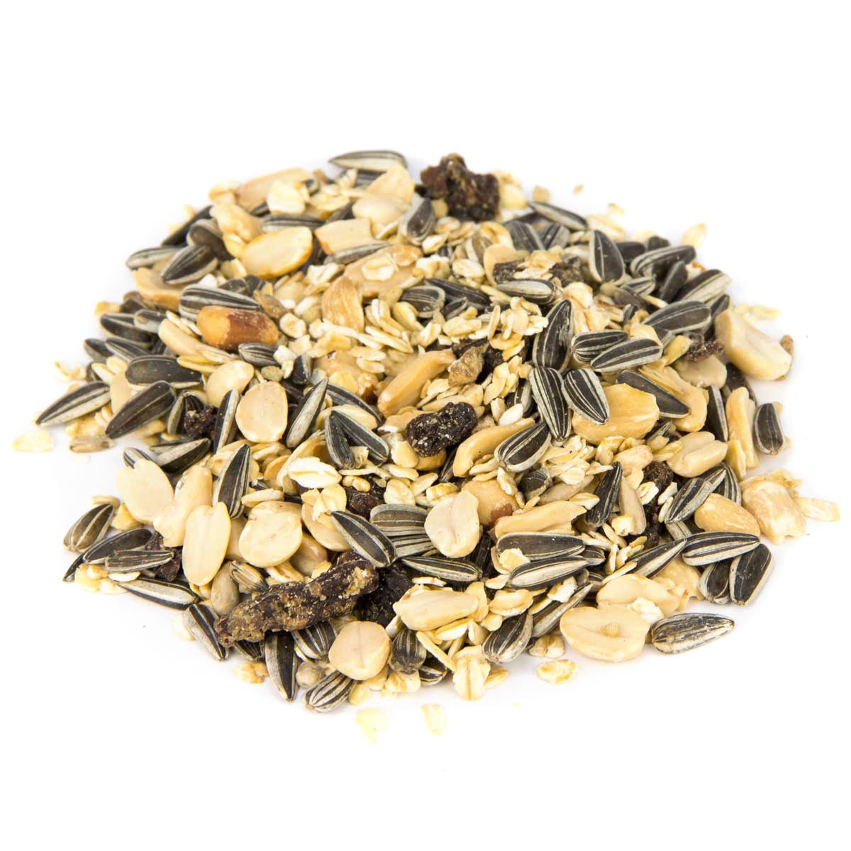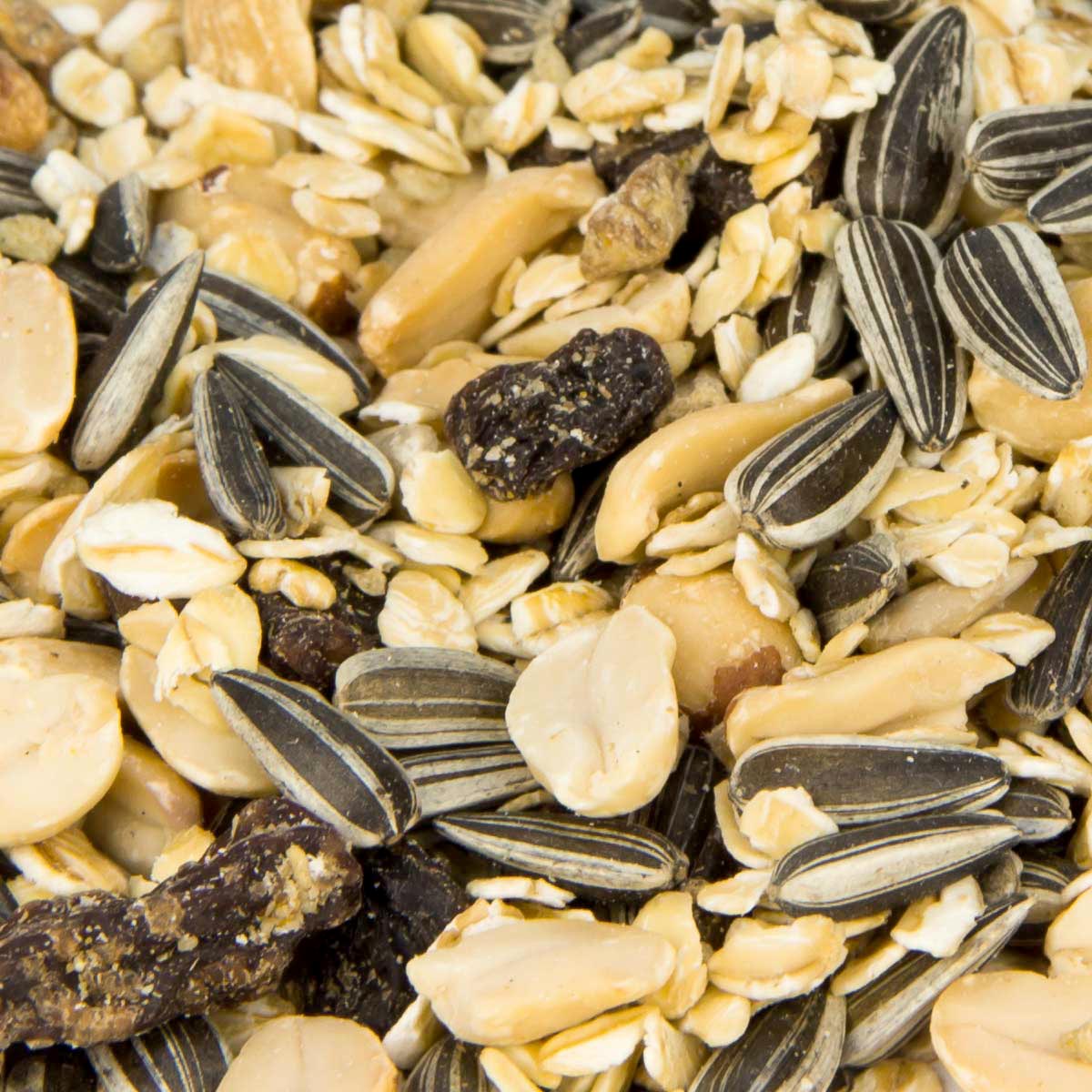 Compoziție: 40,00 % semințe de floarea-soarelui vărgate, 28,00 % fulgi de ovăz, 20,00 % alune prăjite, 4,24 % produse de panificație, 4,00 % sultane, 0,80 % miere, 0,80 % furaje cu gluten de porumb, 0,80 % gammarus, 0,40 % apă de muște, 0,40 % zahăr, 0,23 % grăsime mixtă (vegetală), 0,16 % ulei de rapiță, 0,10 % carbonat de calciu, 0,07 % fosfat monocalcic.