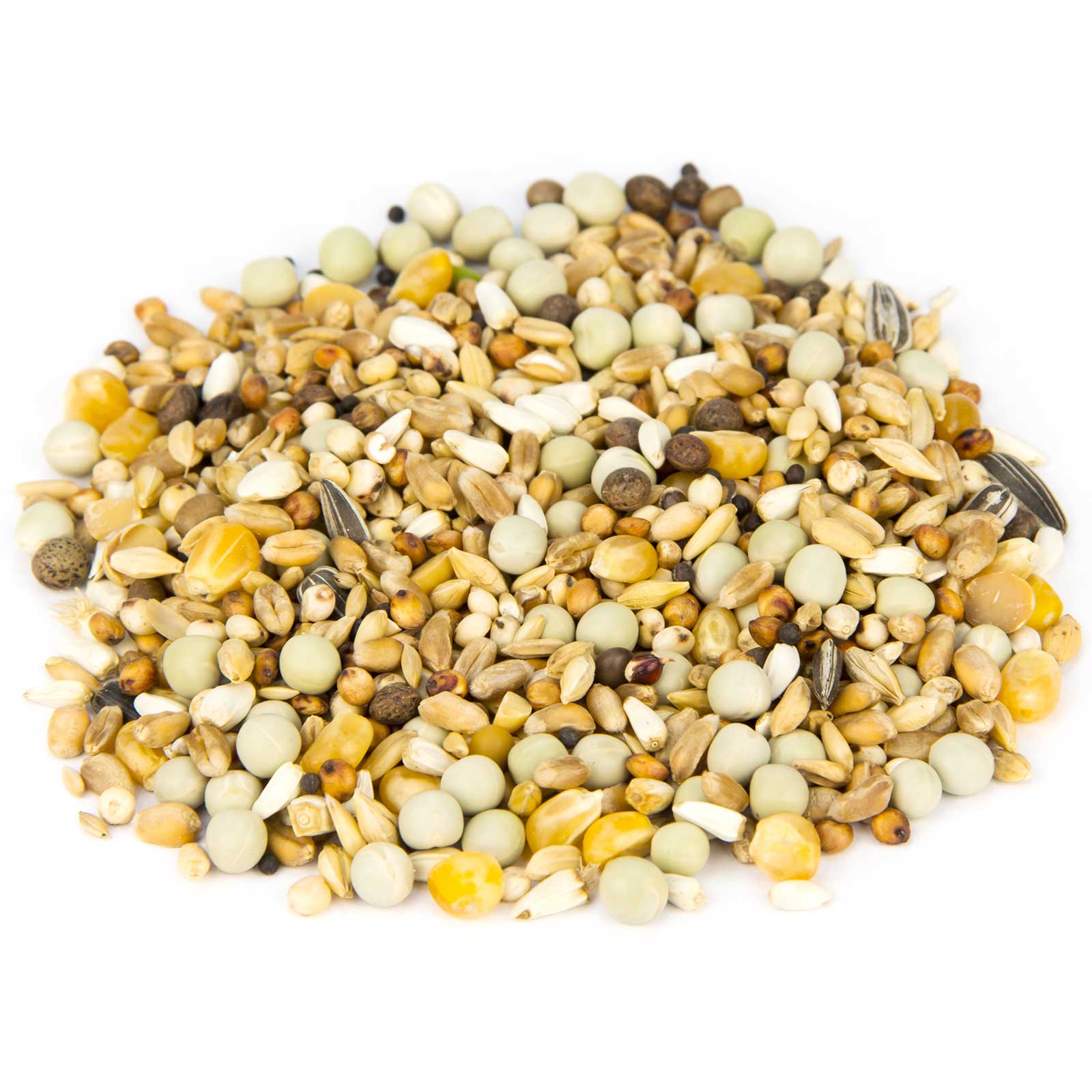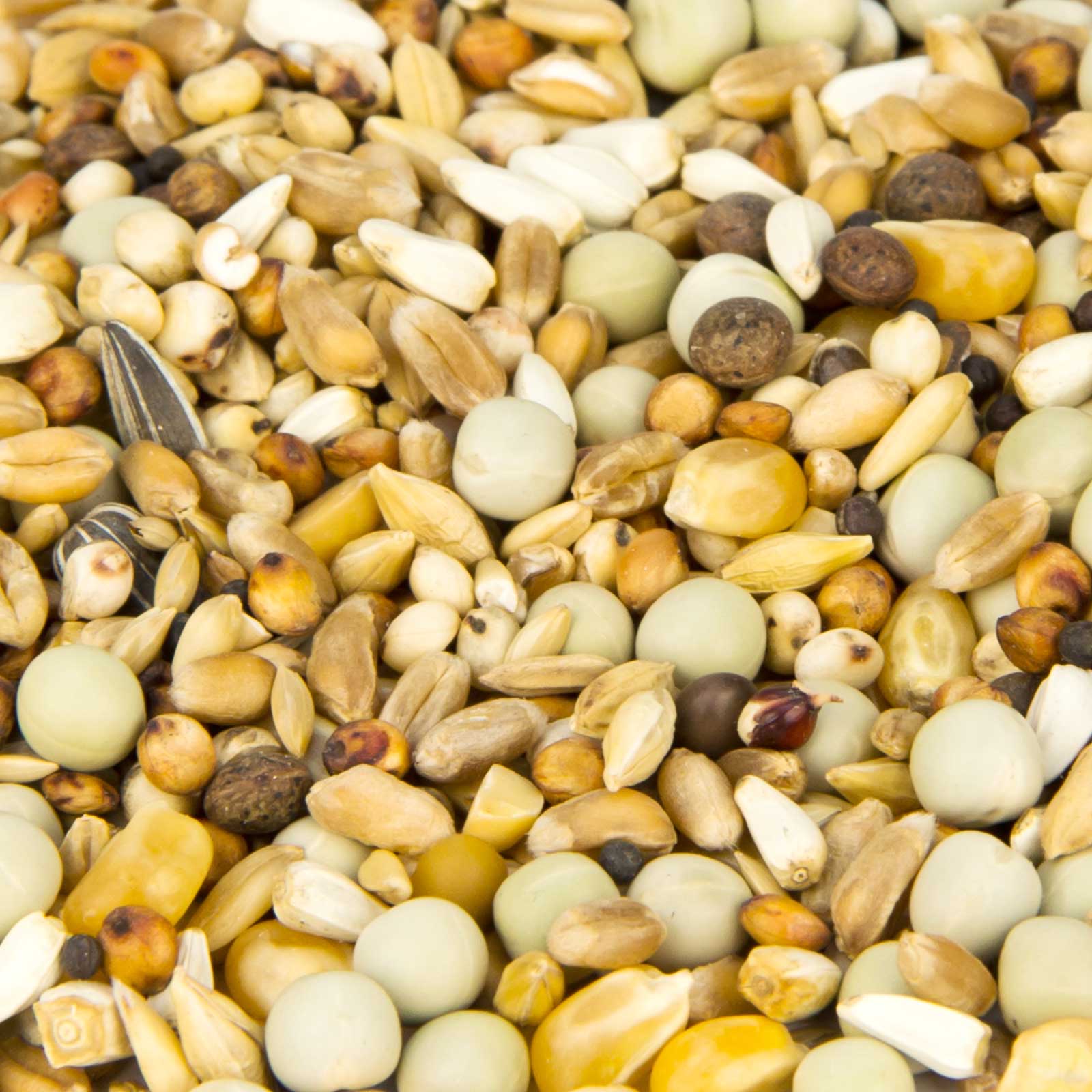 23 % mazăre mică, 19 % grâu, 9 % semințe de cardi, 9 % boabe de milo, 8 % porumb perlat, 6 % dari, 5 % vetches, 4 % orez nedecorticat, 2 % soia, 7 % fulgi de ovăz, 2 % floarea-soarelui bătută, 2 % semințe lucioase, 2 % napi negri, 2 % orz de bere.