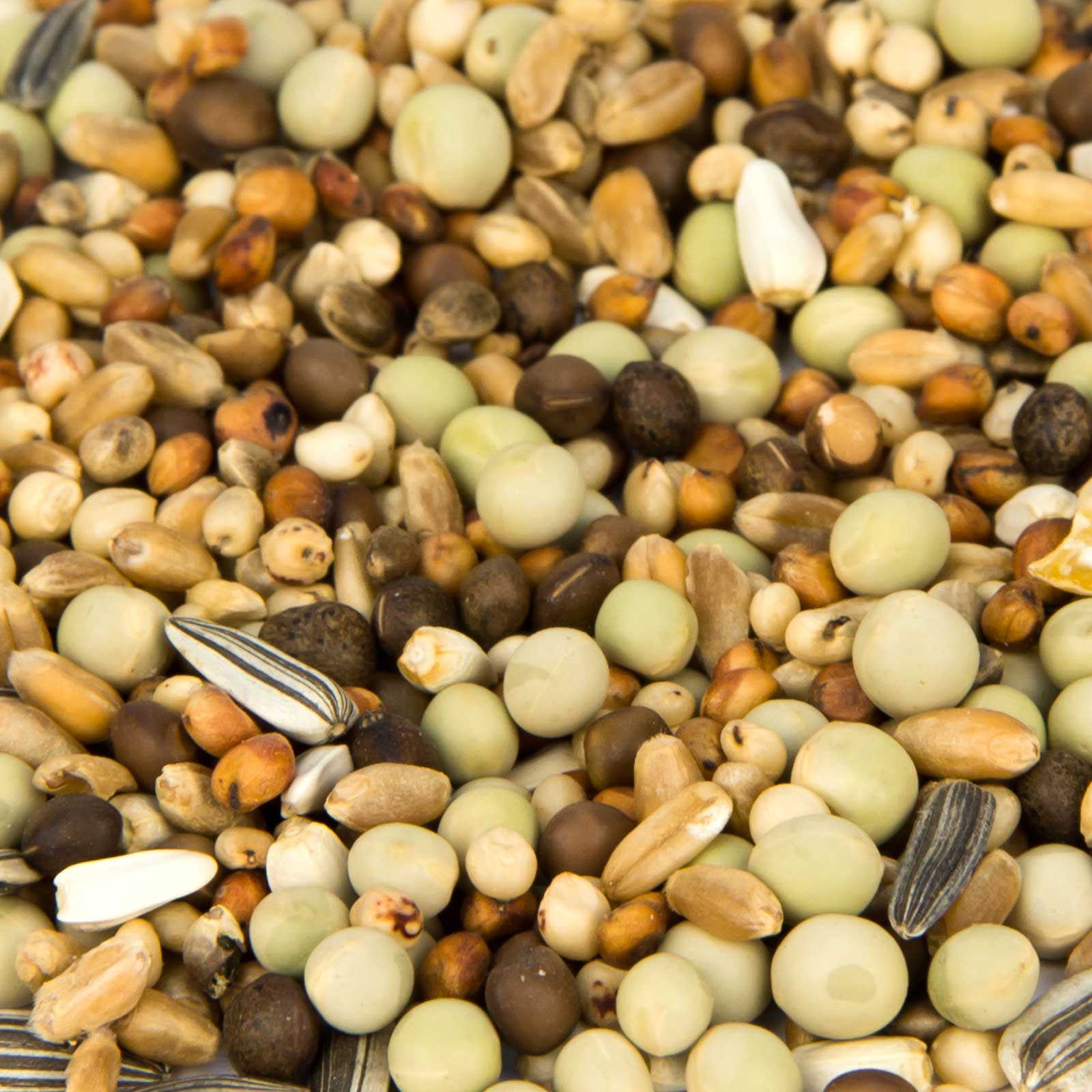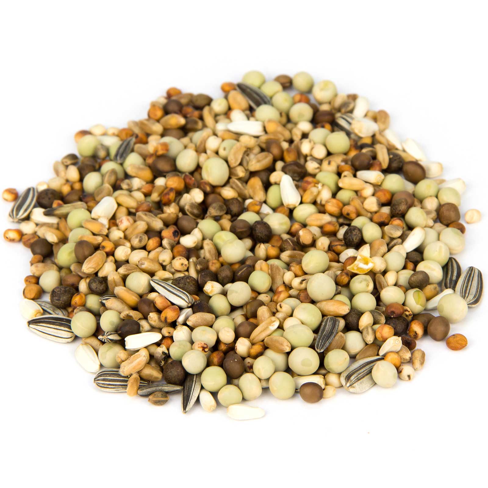 23 % mazăre mică, 17 % grâu, 16 % vită, 14 % boabe de milo, 13 % dari, 6 % semințe de cardi, 4 % tulpini de floarea-soarelui, 4 % cânepă, 3 % fulgi de ovăz.