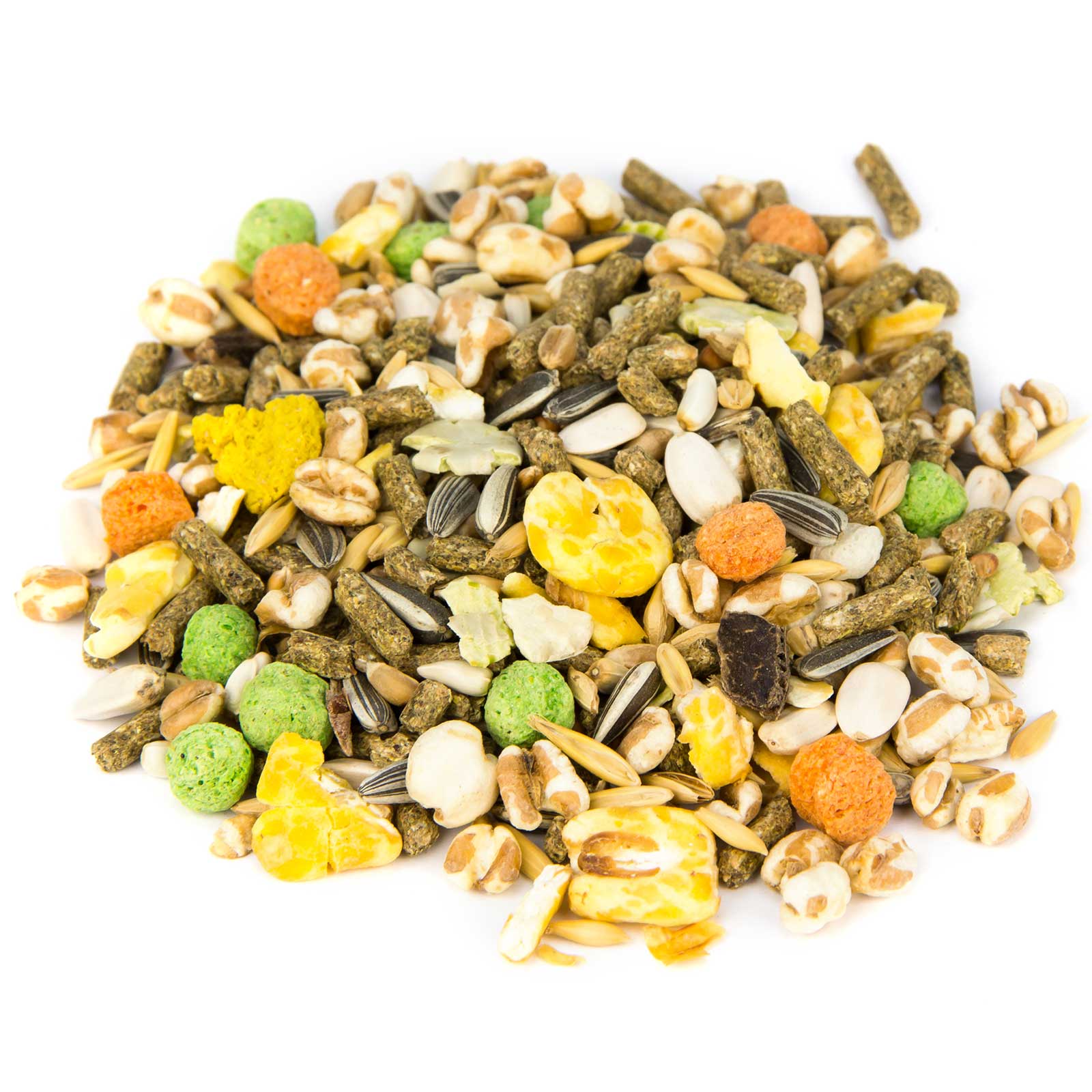 Grâu, tărâțe de grâu grosier, făină verde, porumb încolțit, semințe de floarea-soarelui vărgate, ovăz, orz de bere, fulgi de mazăre, semințe de cardi, boabe de milo, grâu încolțit, concentrat de porumb, pulpă uscată, semințe de floarea-soarelui alb, crochete de porumb roșu, Crochete de porumb verzi, Carob tăiat, Făină de extracție de rapiță cu baton, Turtă de semințe de dovleac, Melasă, Crochete de porumb galbene, Lignoceluloză, Carbonat de calciu, Fosfat monocalcic, Clorură de sodiu, Bicarbonat de sodiu, Oxid de magneziu