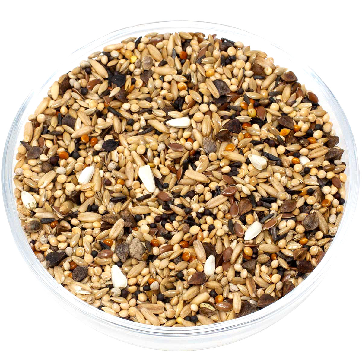 36 % semințe lucioase, 25 % mei galben, 8 % fulgi de ovăz, 7 % semințe negre, 7 % semințe de in, 5 % hrișcă, 4 % mei roșu, 4 % rapiță neagră, 2 % semințe de cardi, 1 % cânepă, 1 % semințe de perilla albă.