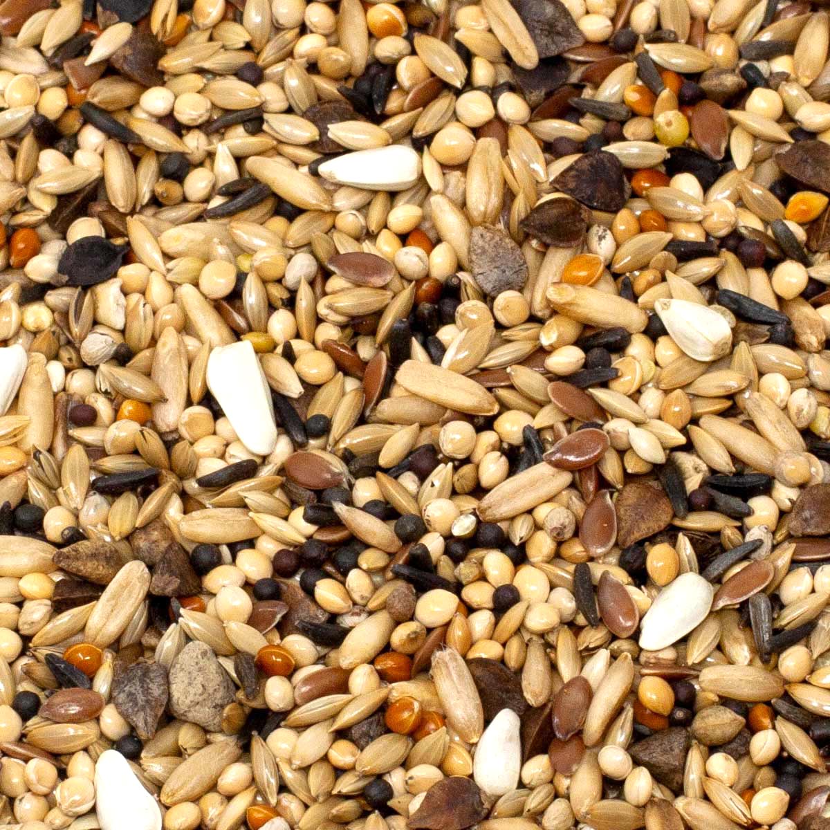 36 % semințe lucioase, 25 % mei galben, 8 % fulgi de ovăz, 7 % semințe negre, 7 % semințe de in, 5 % hrișcă, 4 % mei roșu, 4 % rapiță neagră, 2 % semințe de cardi, 1 % cânepă, 1 % semințe de perilla albă.